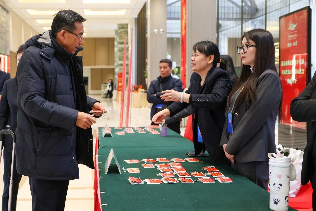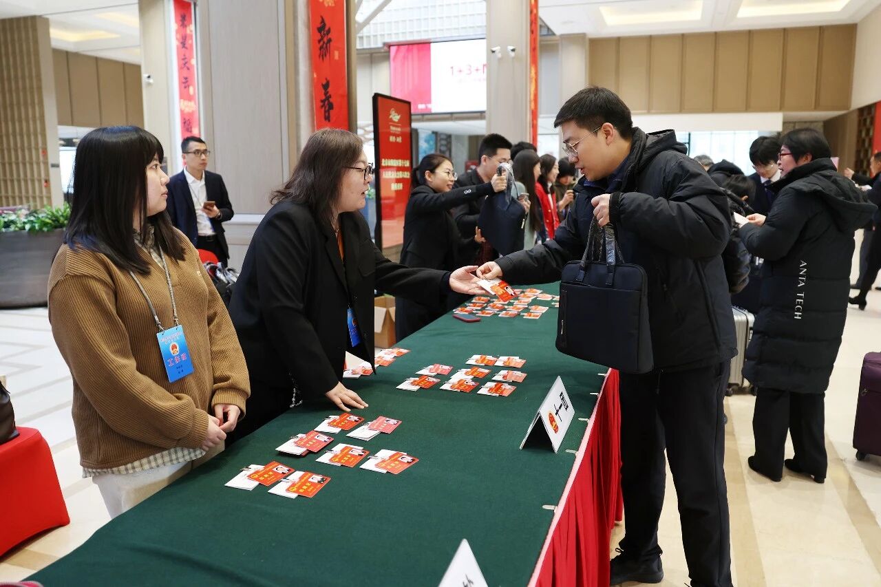 报到现场,人大代表们在工作人员引导下有序完成登记签到,领取出席证和会议材料。